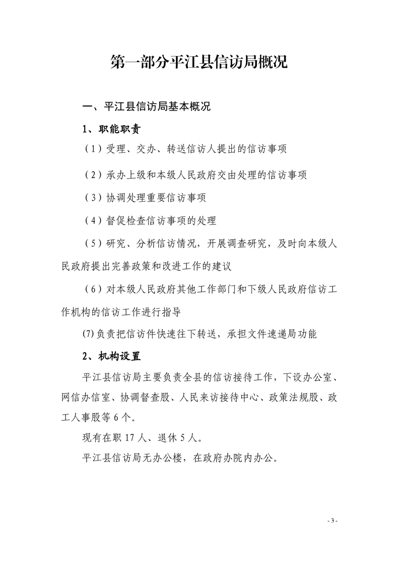 平江县信访局主要负责全县的信访接待工作,下设办公室、网信办信室、协调督查股、人民来访接待中心、政策法规股、政工人事股等6个。