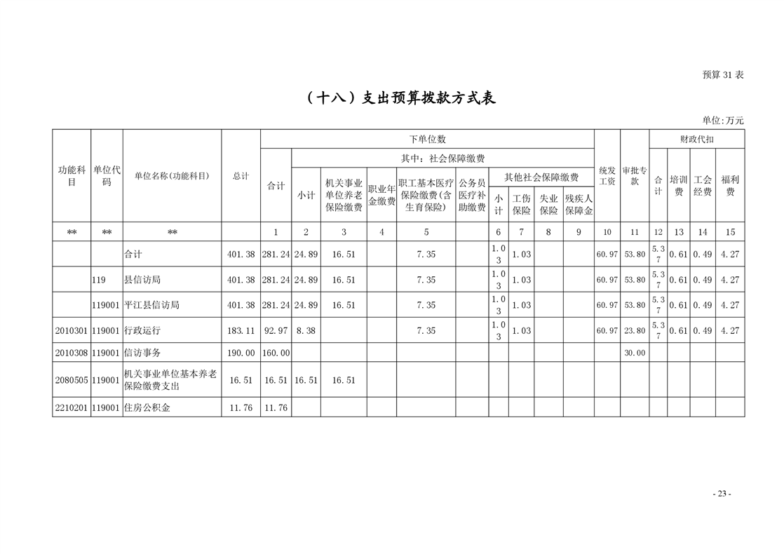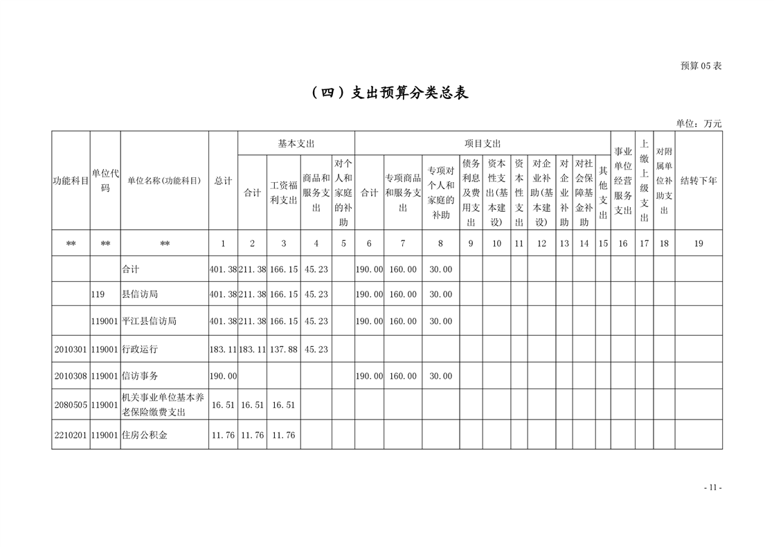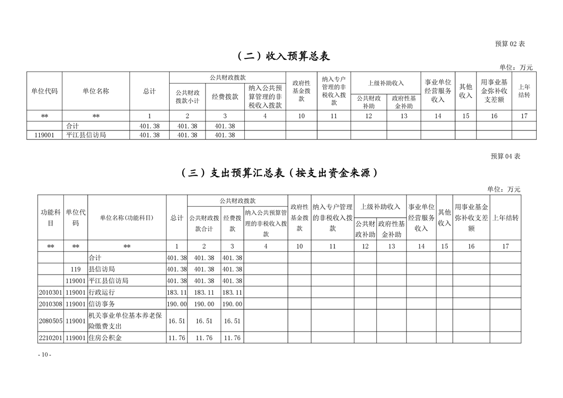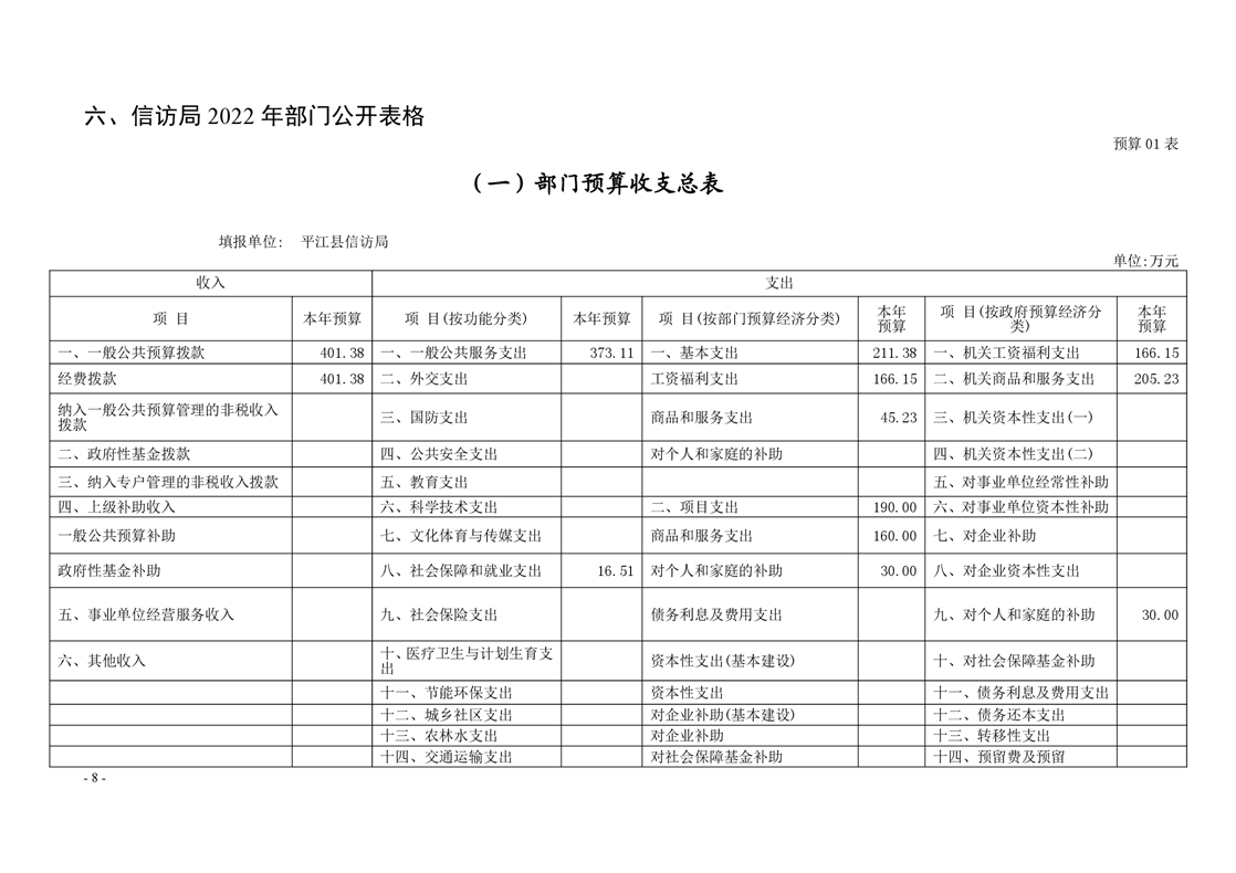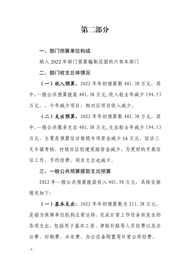 (二)支出预算,2022年年初预算数401.38万元,其中,一般公共服务支出401.38万元。支出较去年减少194.53万元,主要是预算信访维稳专项资金减少14万元,信访三无乡镇考核、村级社区创建奖励资金减少,为更好的开展信访工作,节约经费,项目支出也减少。