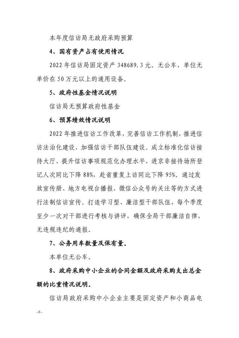2022年信访局固定资产348689.3元。无公车、单位无单价在50万元以上的通用设备。