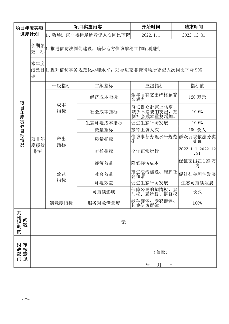 (二)项目支出:2022年年初预算数为190万元,是指单位为完成特定行政工作任务或事业发展目标而发生的支出,包括有关事业发展专项、专项业务费、基本建设支出、对市县专项补助等。其中:中央、省、市驻会维稳经费30万元,主要用于驻办事处维稳开支;信访专项救助资金30万元,主要用于信访者困难救助;主要用于基层信访维稳整体开支,驻京维稳工作组经费120万元,主要用于驻京办维稳整体开支;信访维稳专项10万元,主要用于上访维稳专项开支。