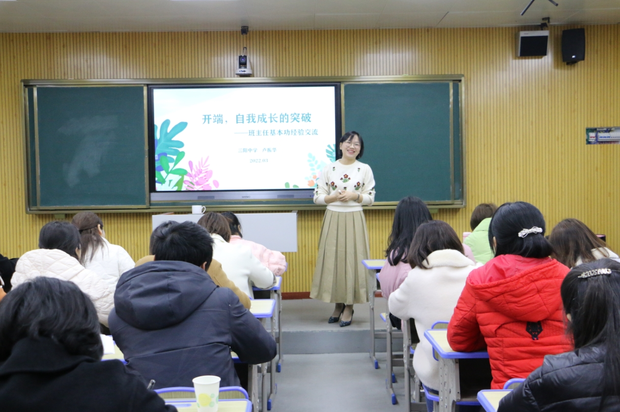 学校特邀三阳中学的卢振华老师前来讲座,她是全县初中心理健康名师工作室成员、汉昌学区家庭教育工作室讲师、国家二级心理咨询师,其班主任工作案例入选全国典型经验名单。她以《开端,自我成长的突破》为题,结合参加全国中小学班主任基本功竞赛的心路历程和工作经历,在谈笑间带给大家深刻的启示,让各班主任受益匪浅。