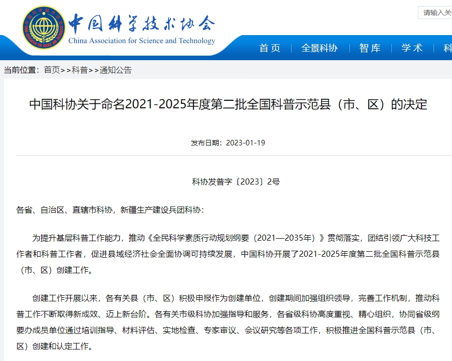 ▲2021-2025年度第二批全国科普示范县(市、区)