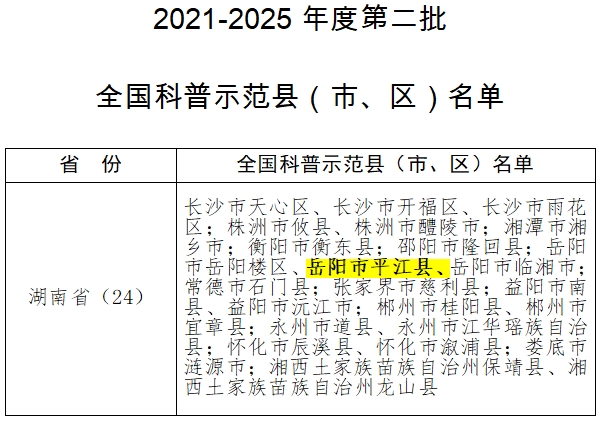 近日,中国科协公布了第二批全国科普示范县名单,岳阳市平江县 榜上有名!