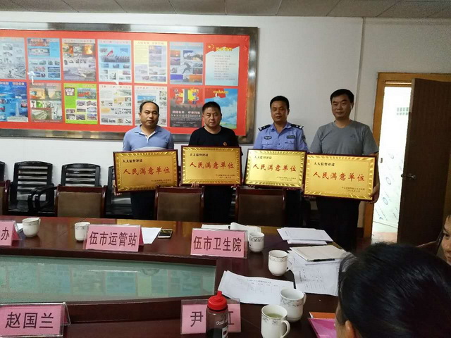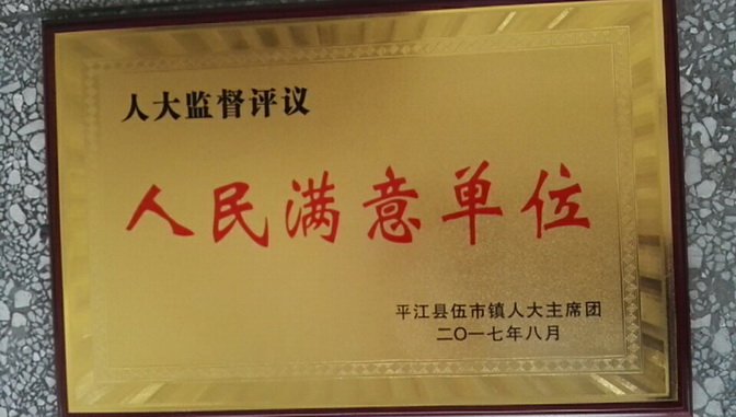 2017年8月25日上午,平江县伍市镇政府召开人大评议监督大会,伍市镇党委、政府主要领导、班子成员、全体人大代表、部门负责人参加会议,会上,交警五中队中队长张校威向全体人大代表汇报了2017年以来的工作,与会领导和全体代表给予了充分肯定,通过全体代表现场投票计分评议,平江公安交警五中队被评为“人民满意单位”,并颁发了奖牌。