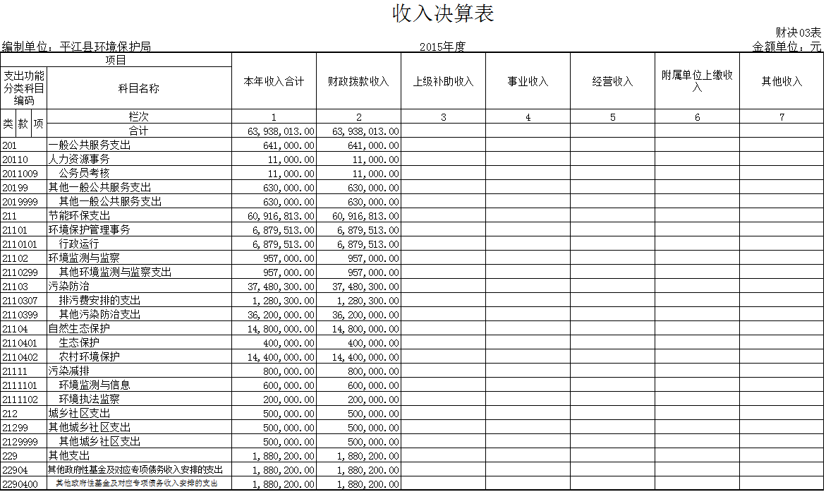 1、收入情况:2015年全年总收入6393.80万元,财政拨款6393.8万元其中①行政运行687.95万元;②其他政府性基金188.02万元③公务员考核1.1万元:④生态保护40万元⑤其他污染防治3620万元:中央拨入重金属治理3600万元的,省级拨入应急处置补助20万元;⑥农村环境整治整县推进1440万元;⑦排污费安排支出128.03万元(执收成本13万元);⑧空气自动监测站建设95.7万元⑨省级对空气自动监测站升级60万元⑩环境执法监察补助20万元;⑾瓮江镇建设50万元;⑿其他一般公共服务支出63万元,