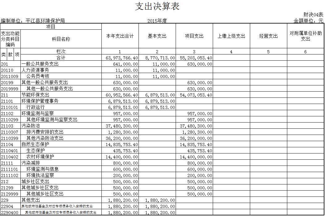 2015年部门预算编报范围包括7个内设机构及6个其他机构,其中7个内设机构:办公室、规划财务股、环境监测和科技标准股、行政审批股、污染与自然保护股(加挂“机动车尾气监督管理股”)、法制宣传股、政工人事股;6个其他机构:平江县环境监察大队(含平江县环境应急与事故调查中心)、平江县环境监测中心、平江县污染物排放总量控制办公室、平江县生态建设办公室(含农村环境整治办公室)、平江县固体废物和辐射管理站、平江县环境信息中心等6家直属事业单位。县环保局机关和直属预算单位人员编制总数74人,实有92人。执法车辆共计4台。收入包括一般公共预算拨款、纳入专户管理的非税收入;支出既包括保障局机关及所属事业单位基本运行的经费,也包括县级支出中由环保局归口管理的环境污染治理等专项经费。