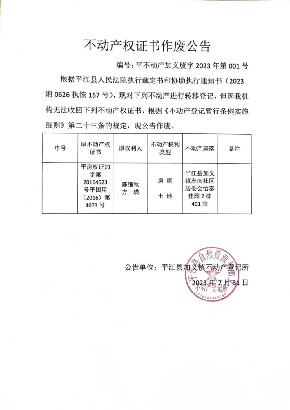 不动产登记公告