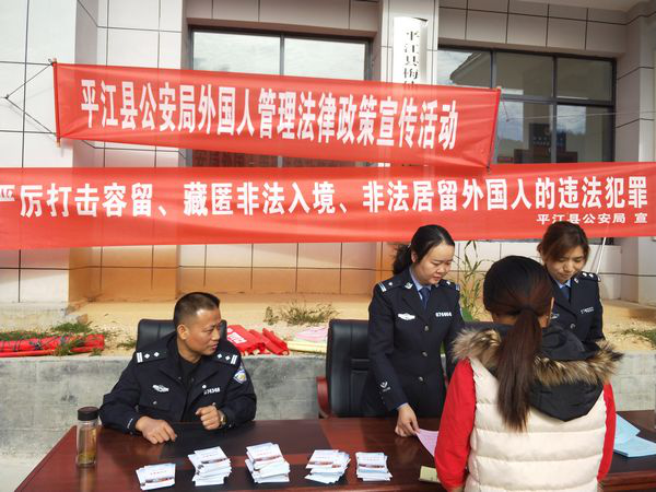 出入境管理大队民警深入到乡、镇以及附近的企业、加工点开展走访宣传,并严厉打击容留、藏匿非法入境、非法居留外国人的违法犯罪活动。发放《中华人民共和国出境入境管理法(节选)》、“结婚登记所需证件”“户口登记管理、居民身份证办理”等相关宣传资料。