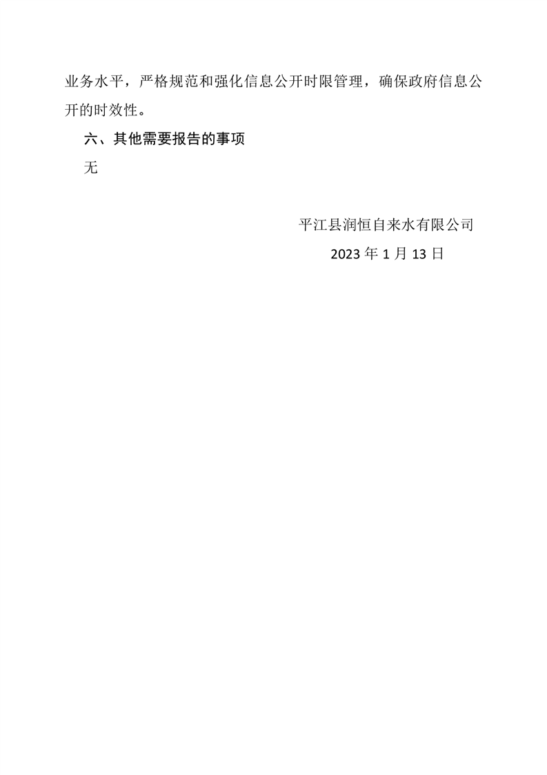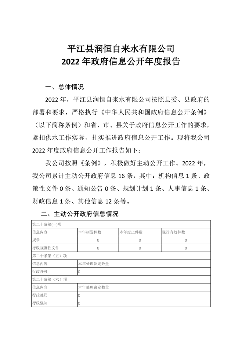 平江县润恒自来水有限公司2022年政府信息公开年度报告