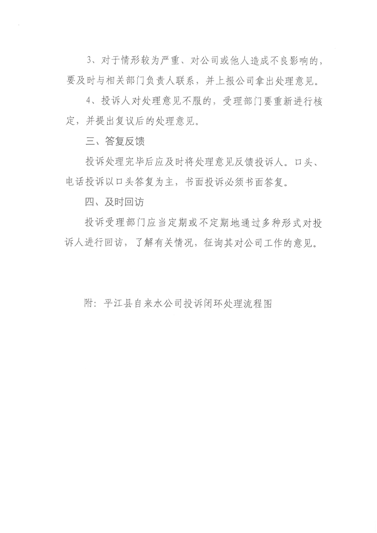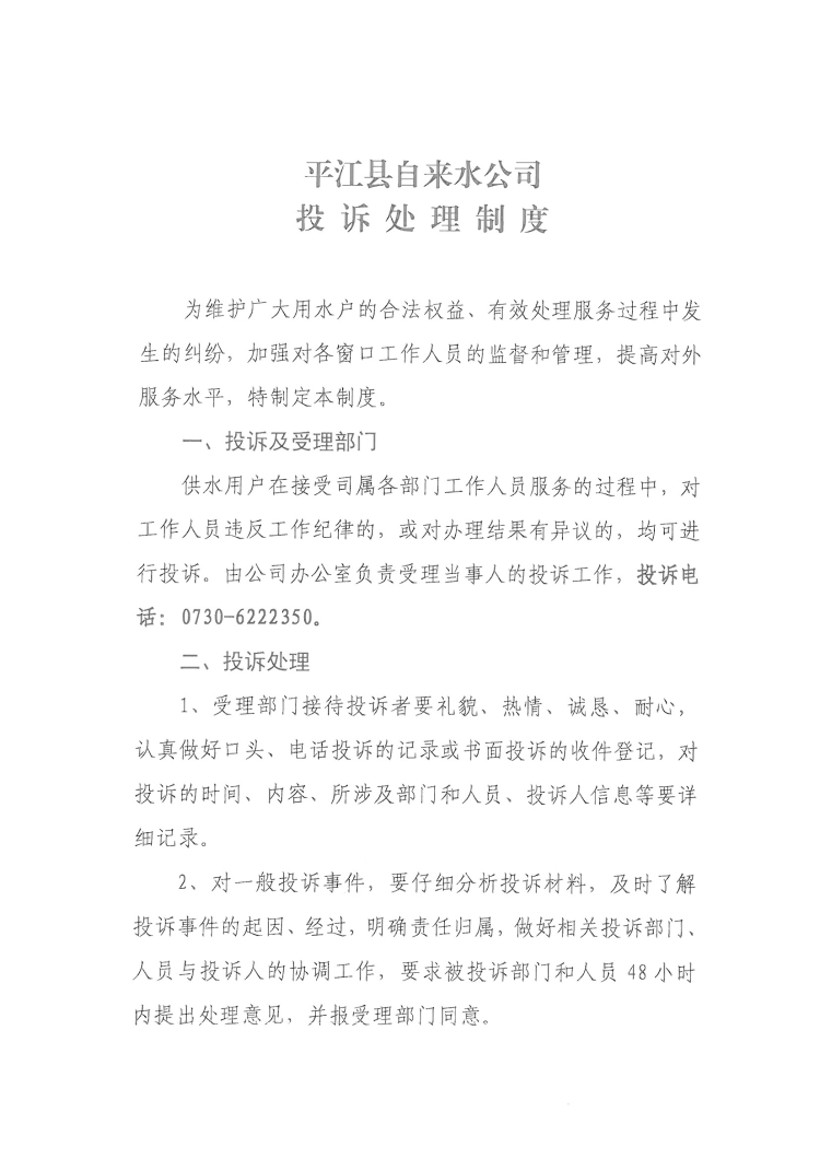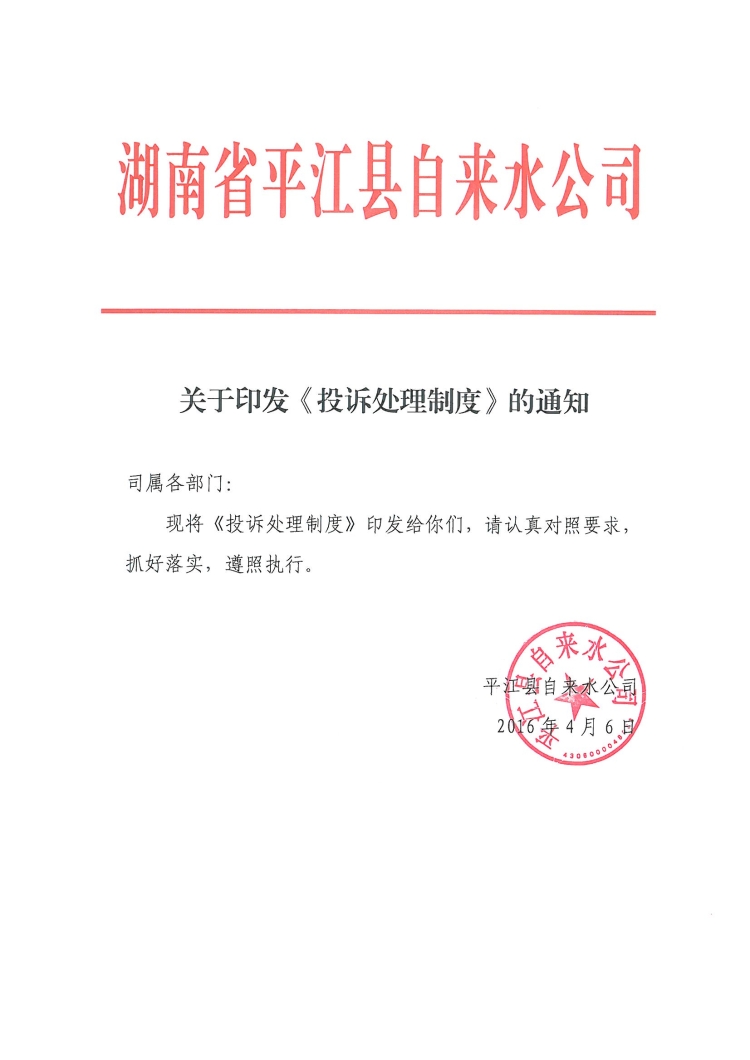 平江县自来水公司《关于印发投诉处理制度的通知》