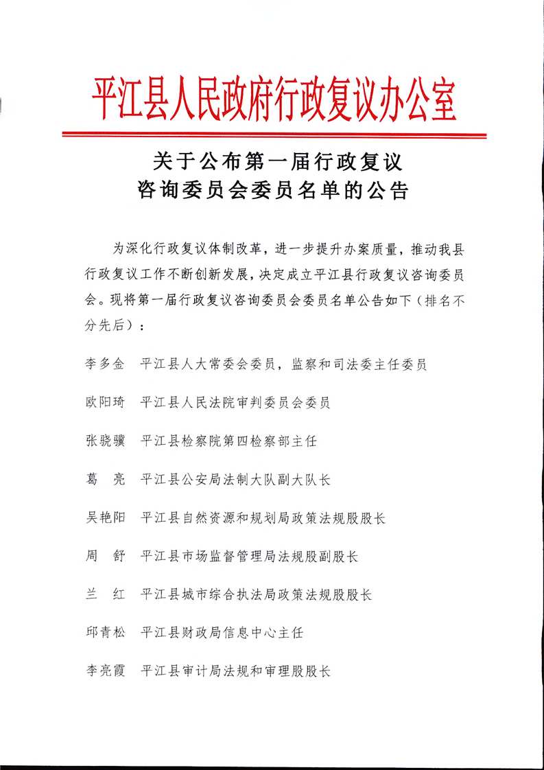 关于公布第一届行政复议咨询委员会委员名单的公告