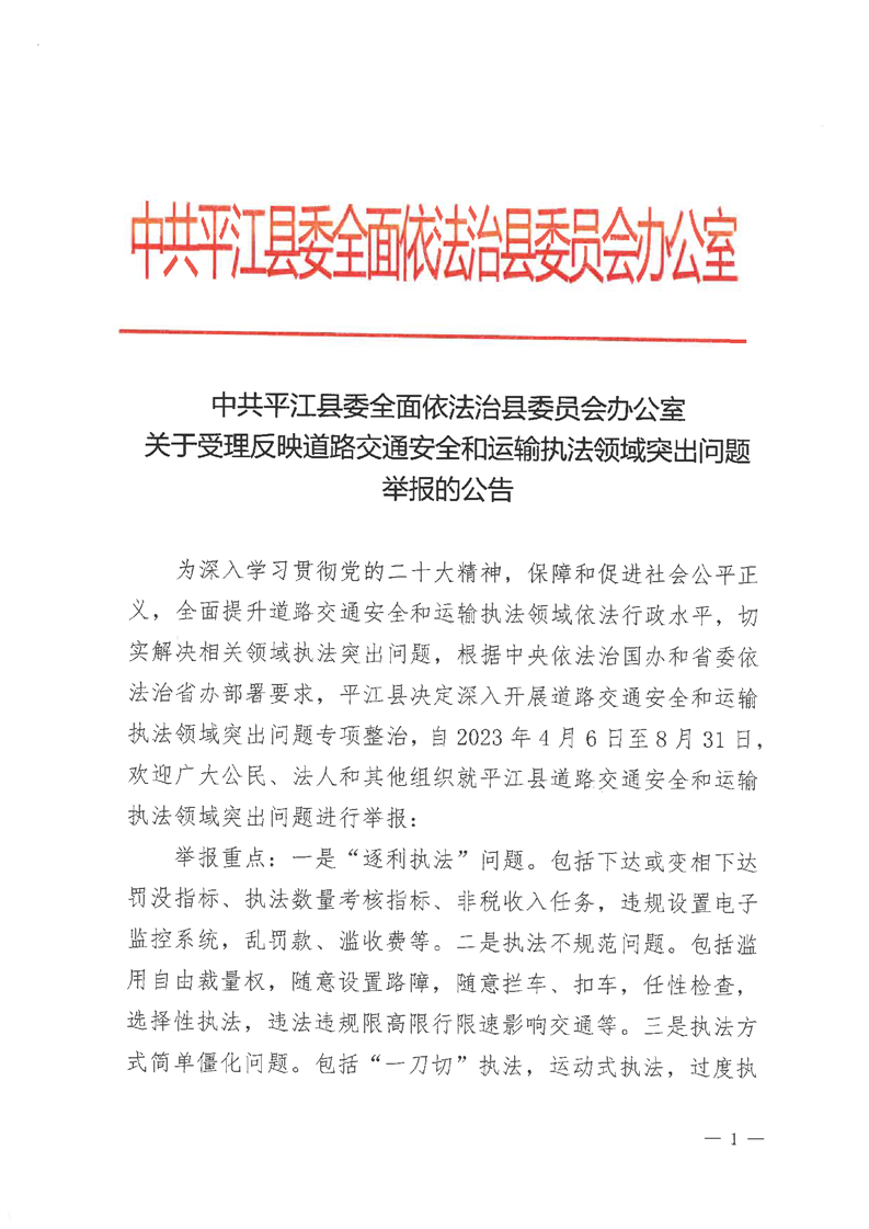 关于受理反映道路交通安全和运输执法领域突出问题举报的公告