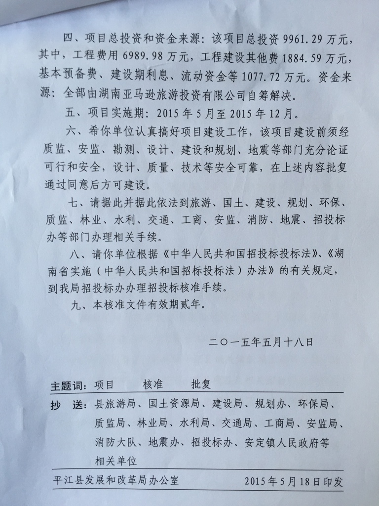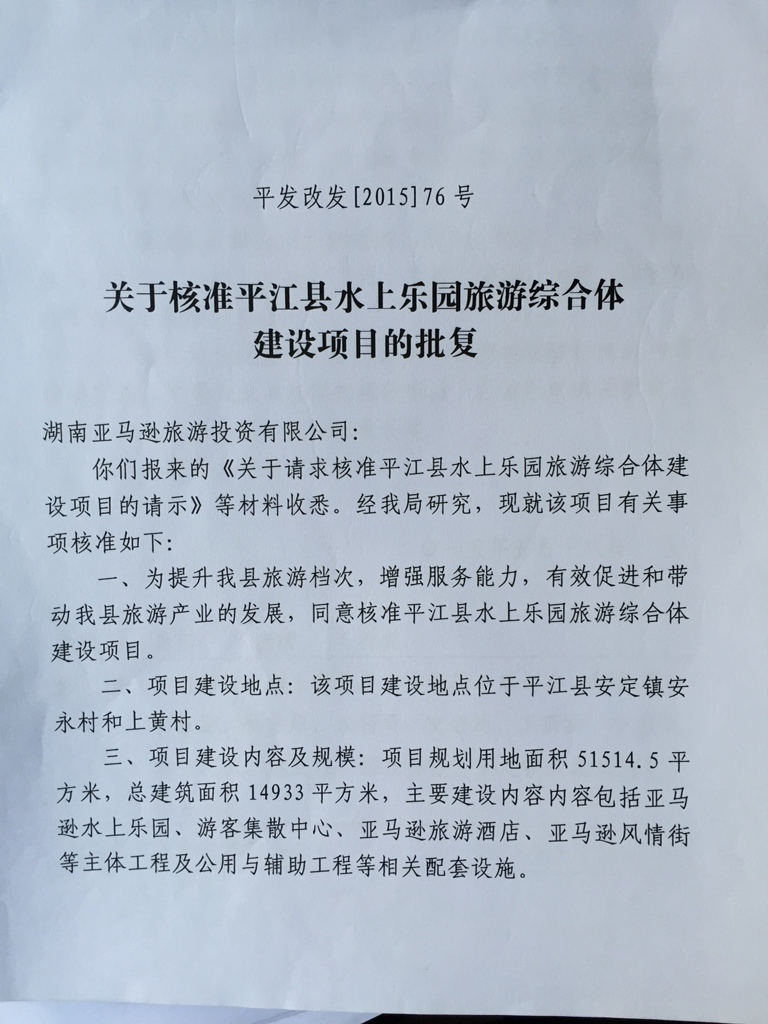 关于核准平江县水上乐园旅游综合体建设项目的批复