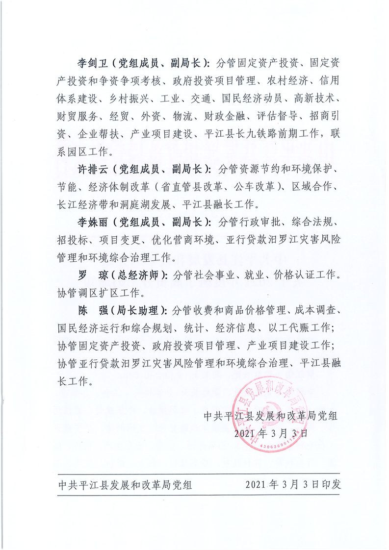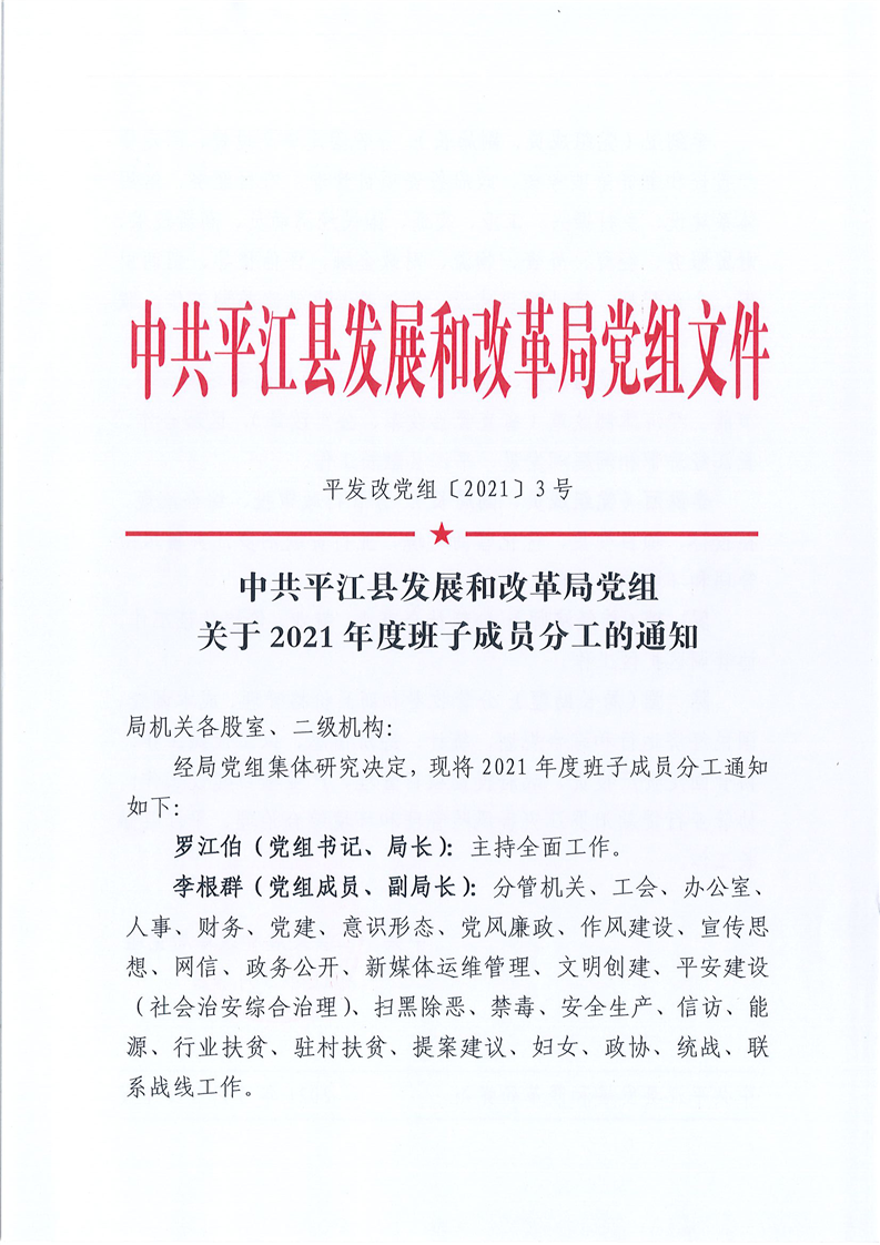 中共平江县发展和改革局党组关于2021年度班子成员分工的通知