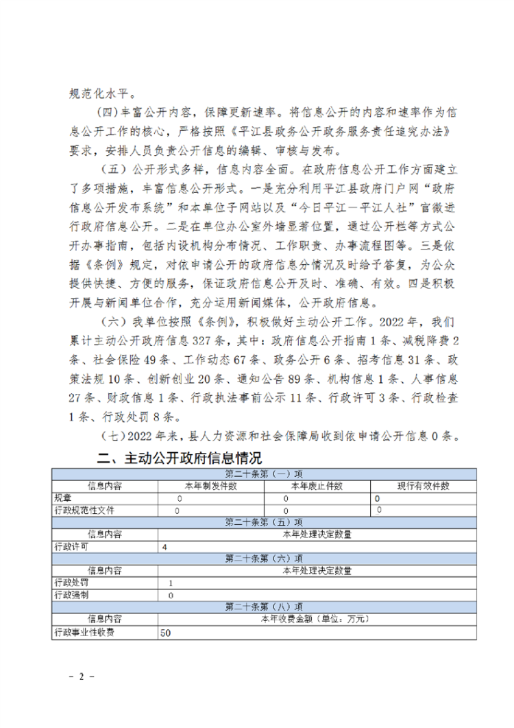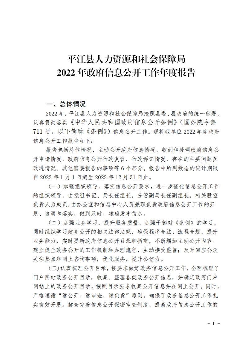 平江县人力资源和社会保障局2022年政府信息公开工作年度报告