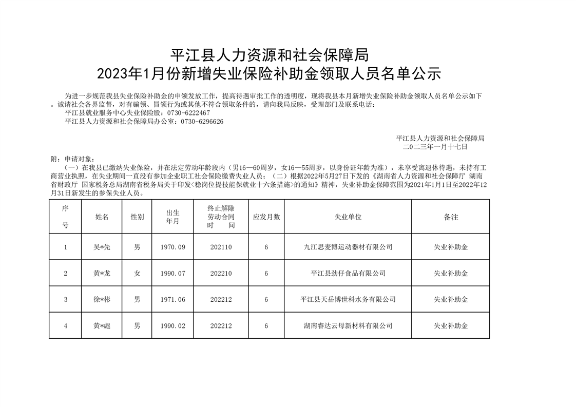 2023年1月新增失业保险补助金领取人员名单公示