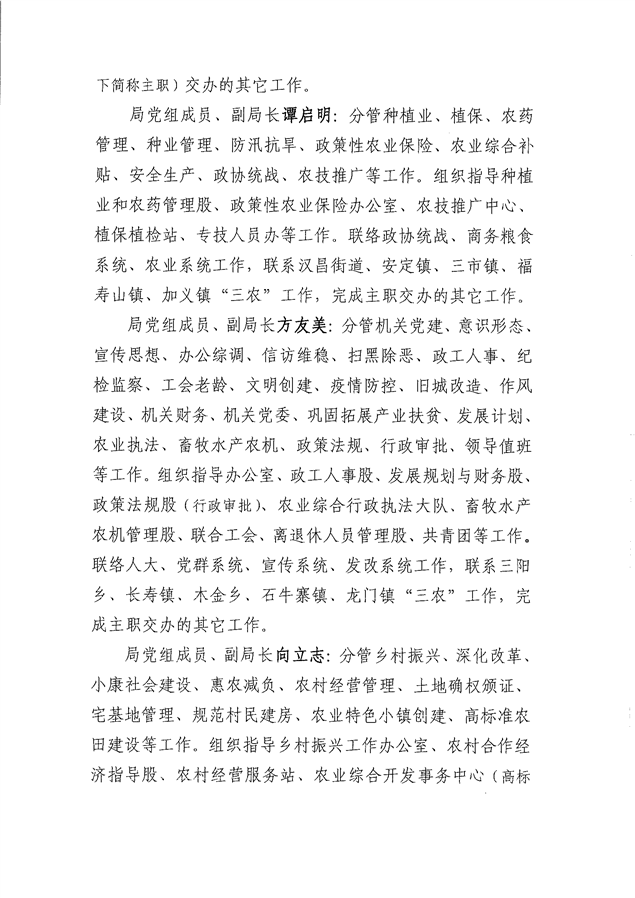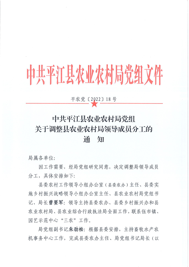 中共平江县农业农村局党组关于调整县农业农村局领导成员分工的通知