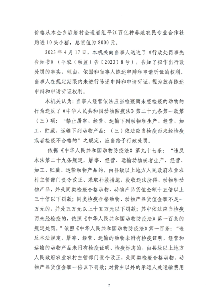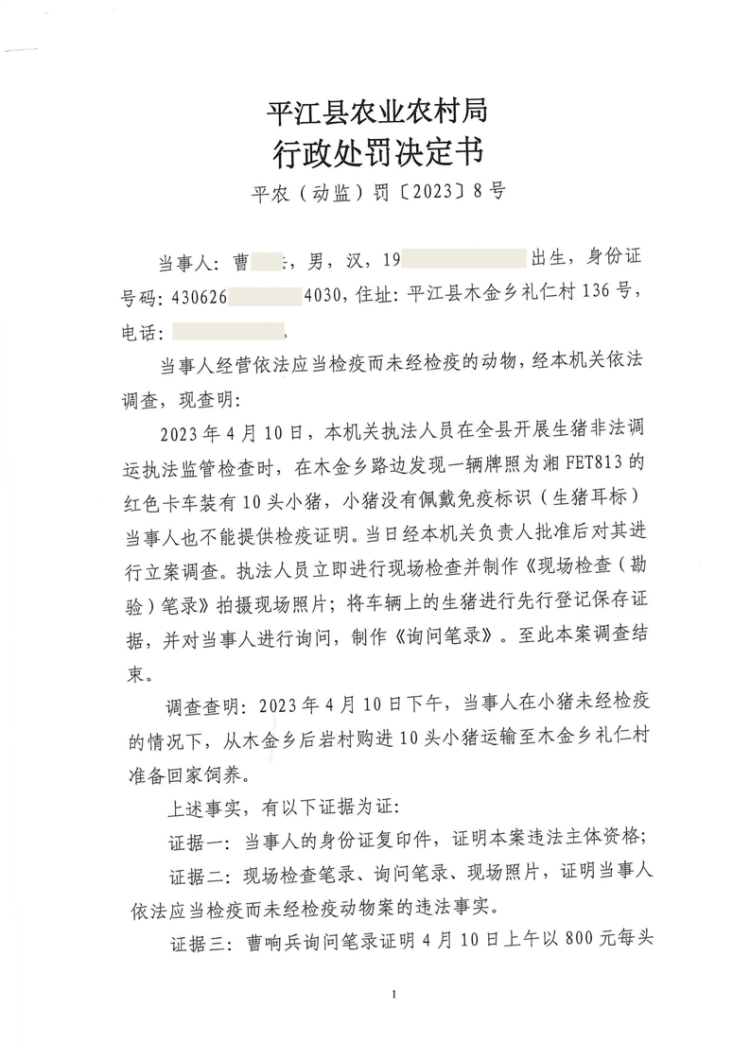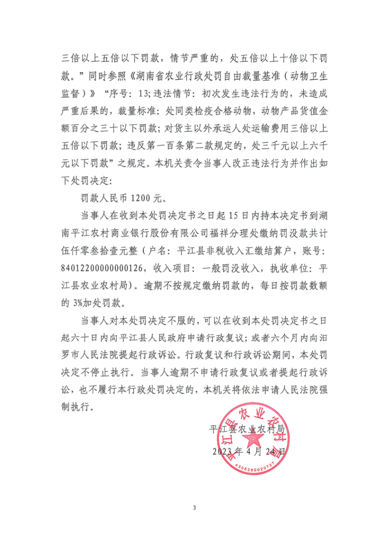 平江县农业农村局行政处罚决定书 平农(动监)罚〔2023〕8号