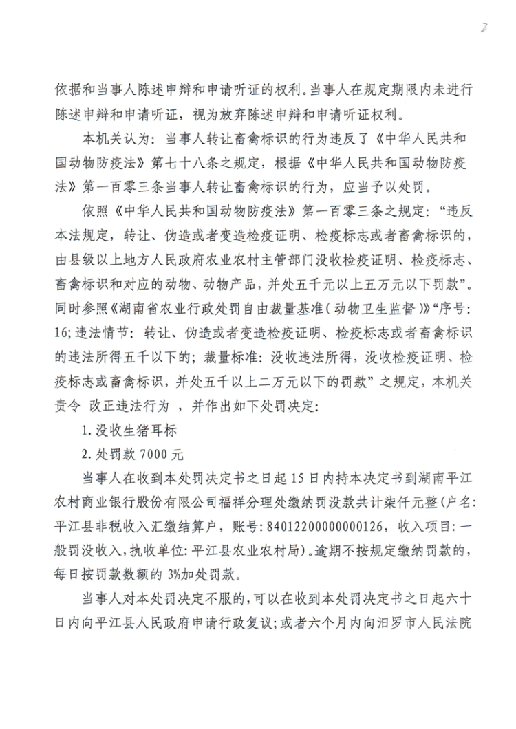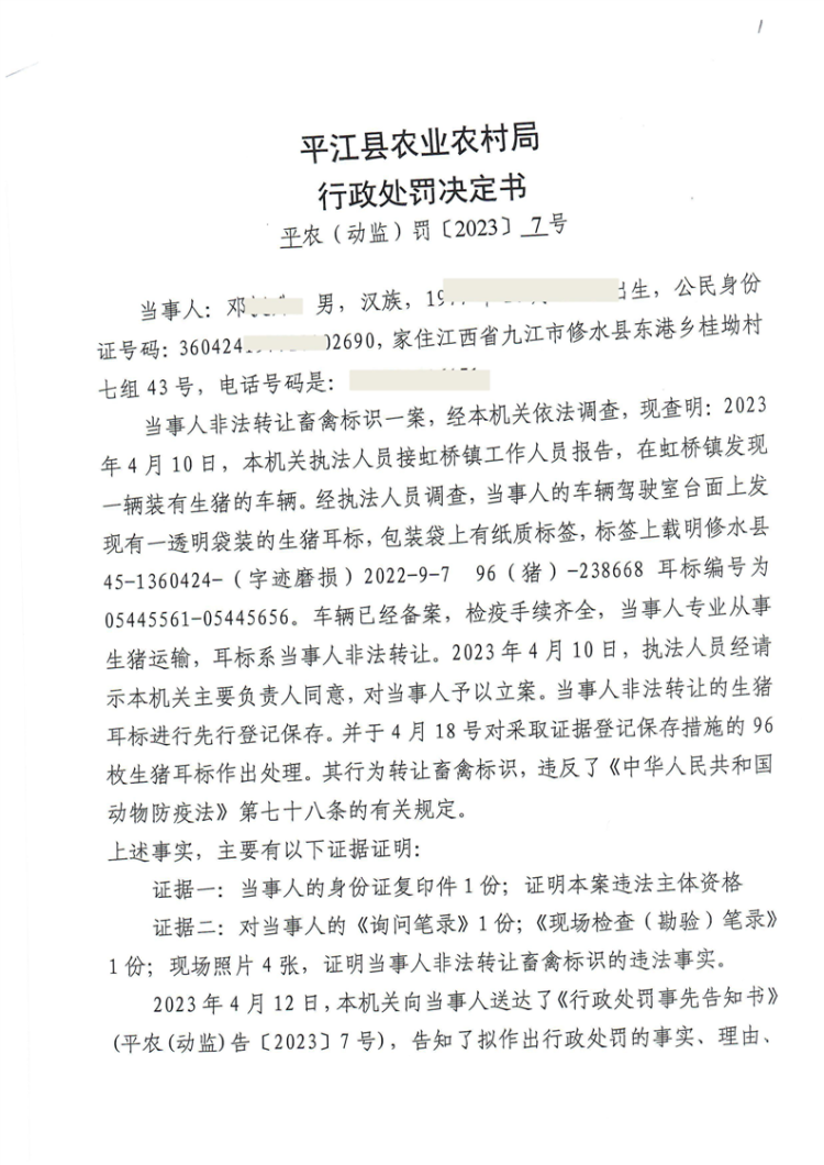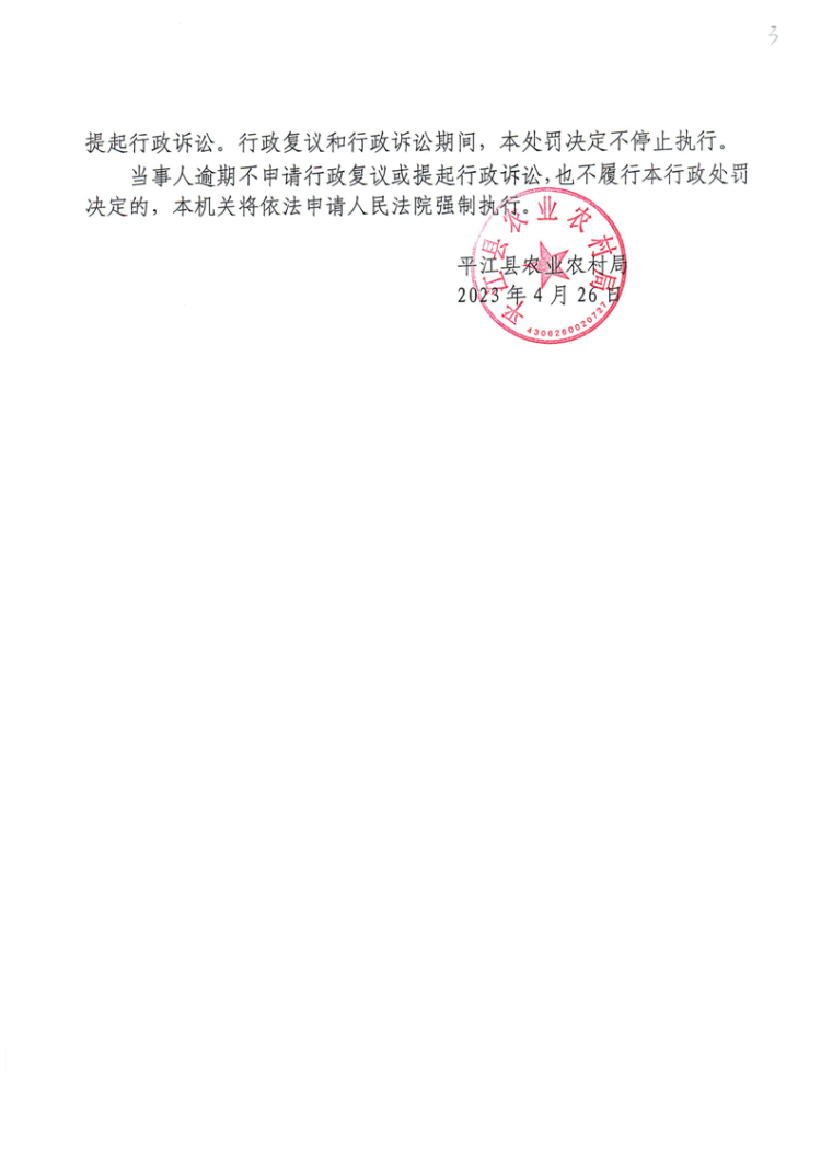 平江县农业农村局行政处罚决定书 平农(动监)罚〔2023〕7号