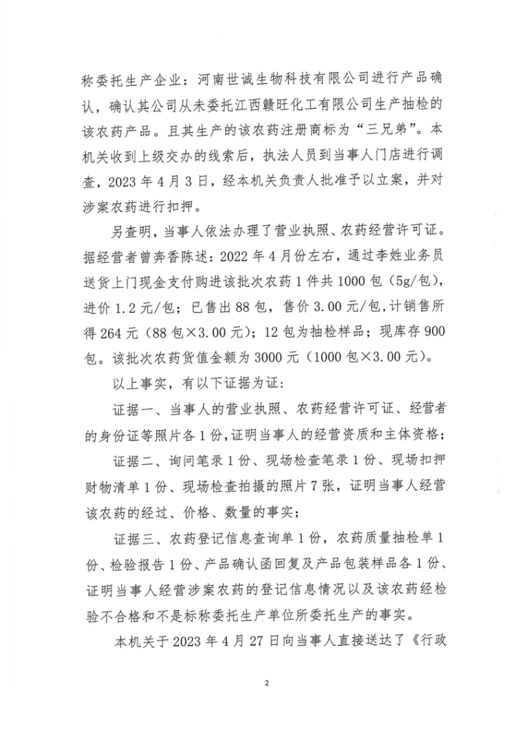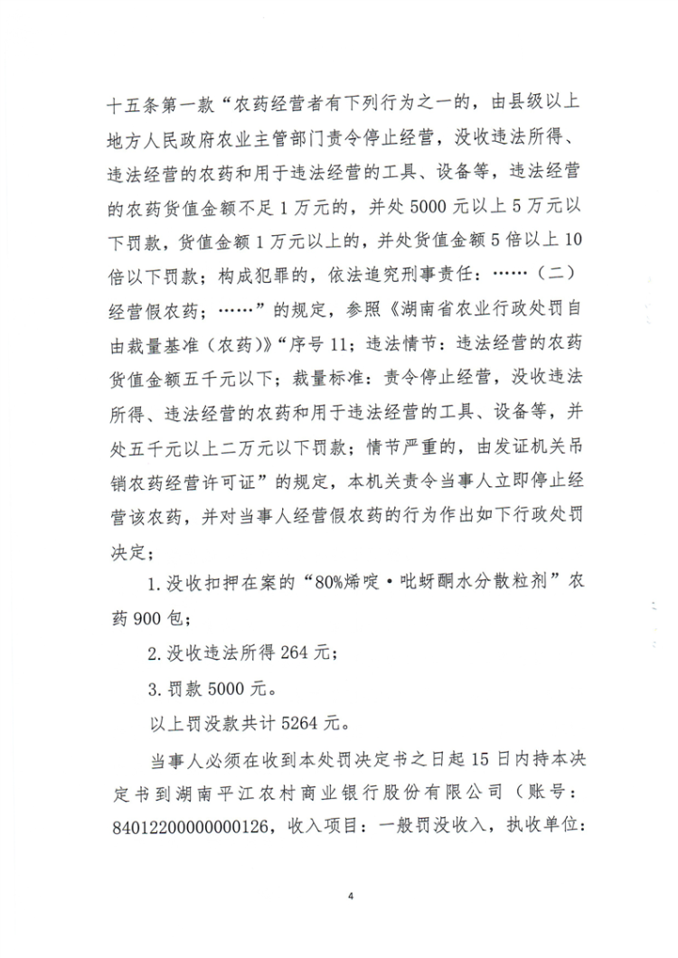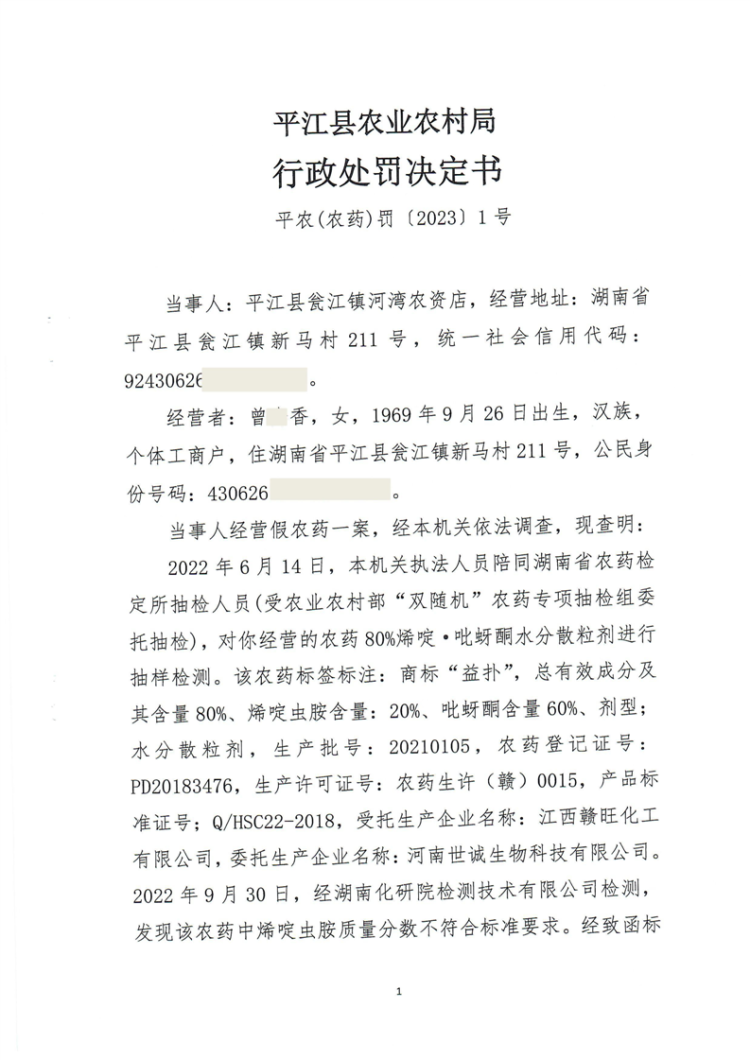 平江县农业农村局行政处罚决定书 平农(农药)罚[2023]1号