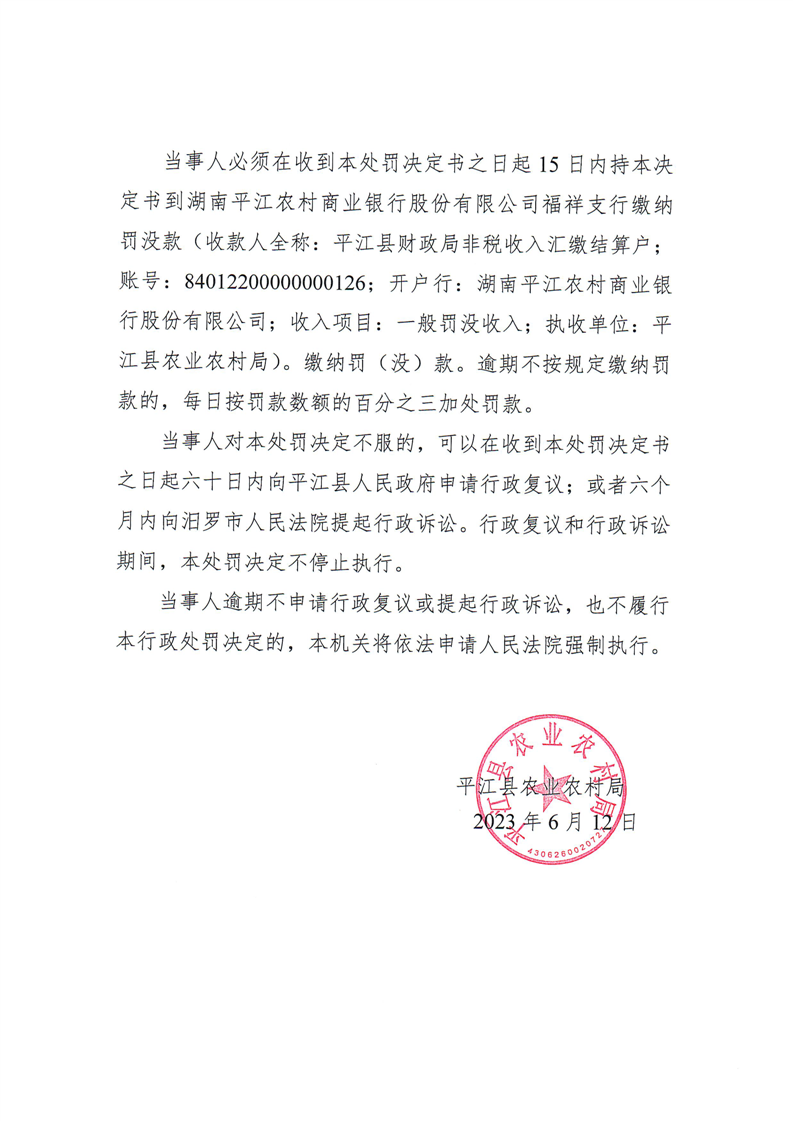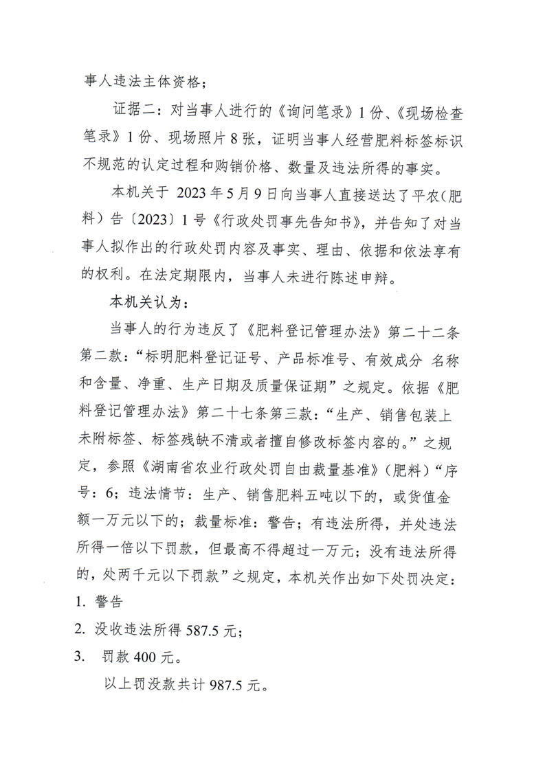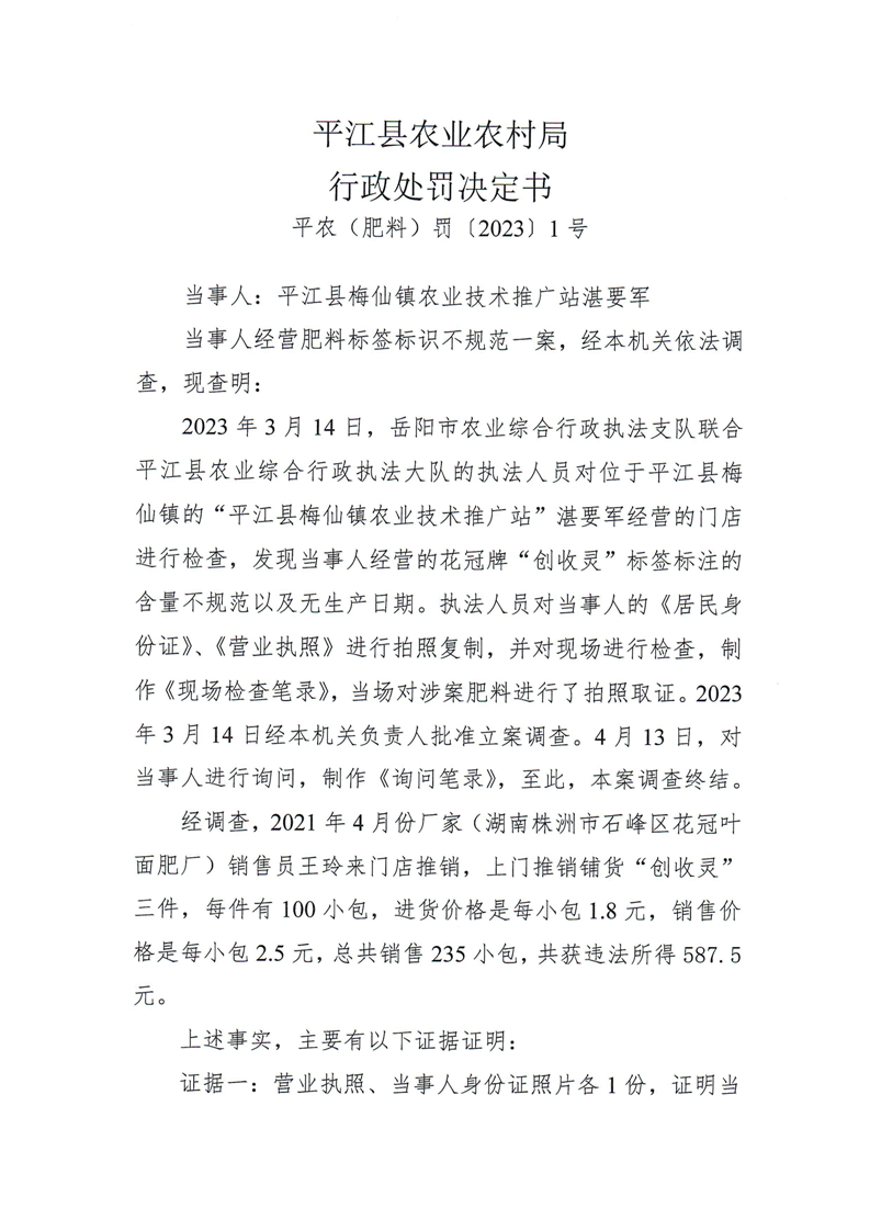 平江县农业农村局行政处罚决定书 平农(肥料)罚[2023]1号