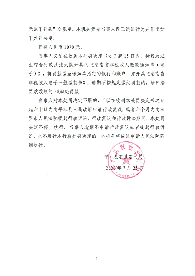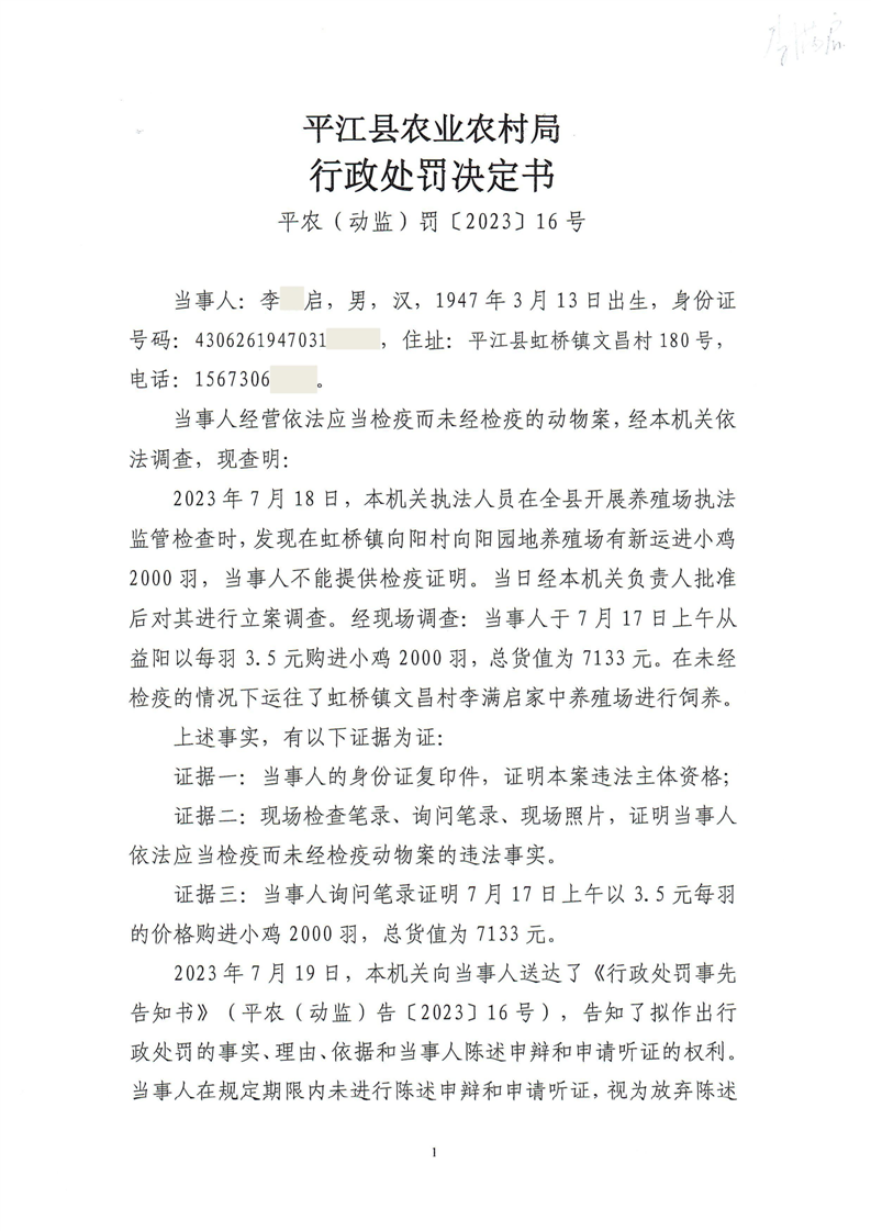 平江县农业农村局行政处罚决定书 平农(动监)罚〔2023〕16号