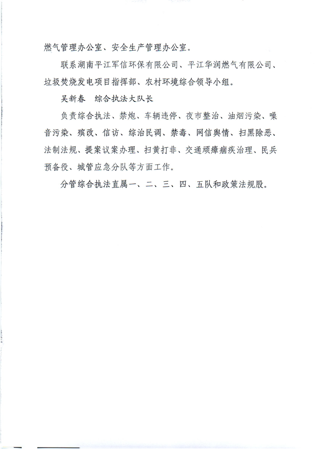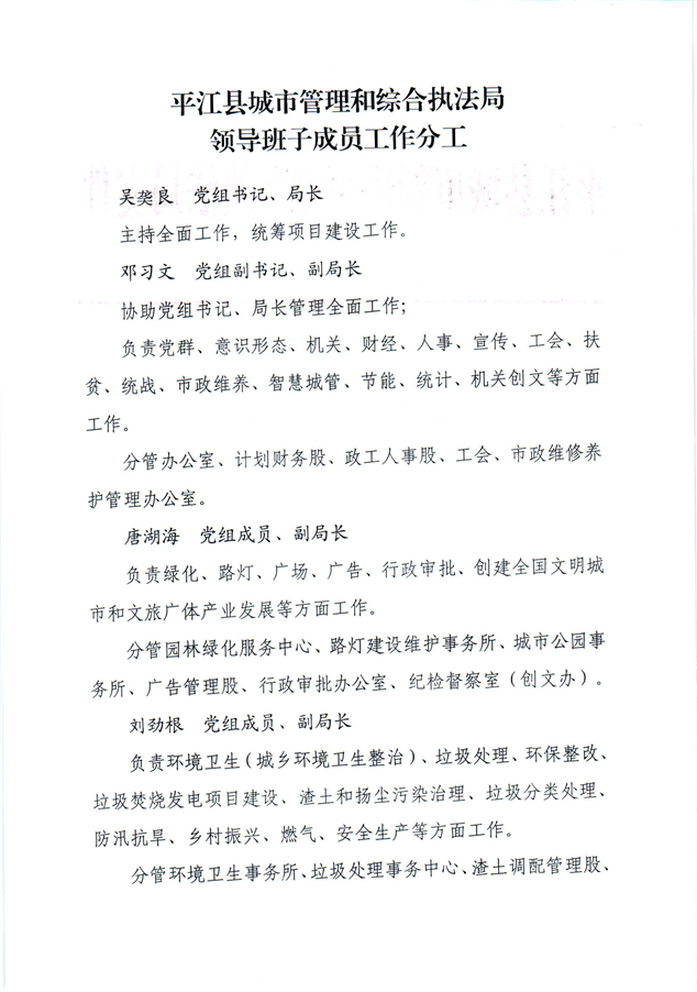 关于印发《平江县城市管理和综合执法局领导班子成员工作分工》的通知