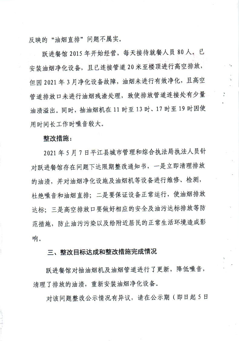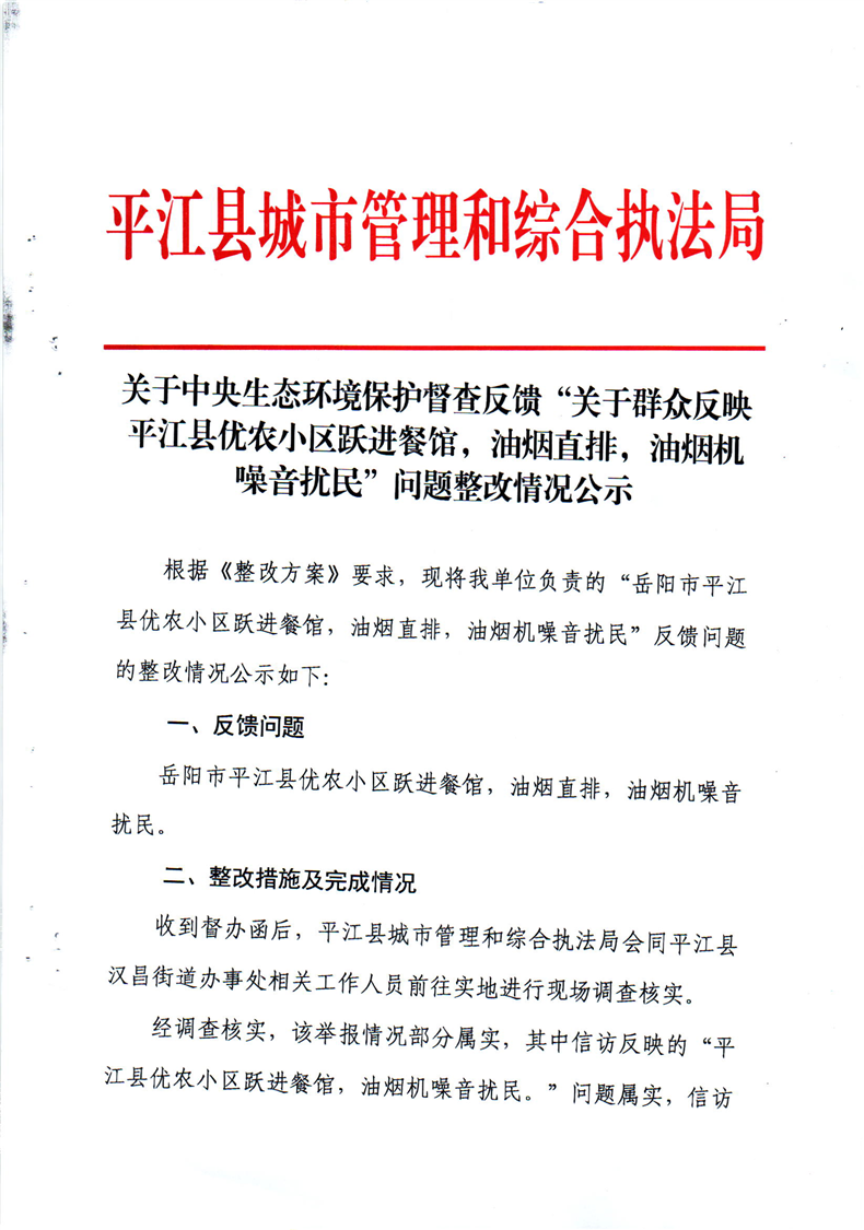 “关于群众反映平江县优农小区跃进餐馆,油烟直排,油烟机噪音扰民”问题整改情况公示