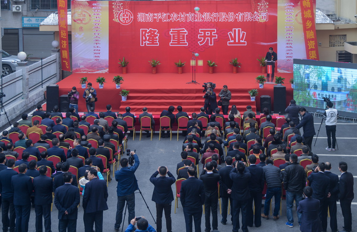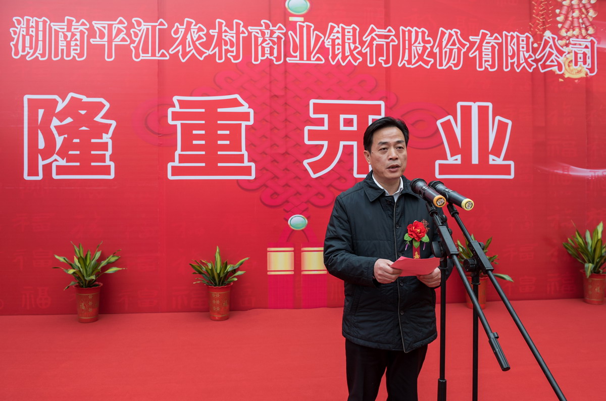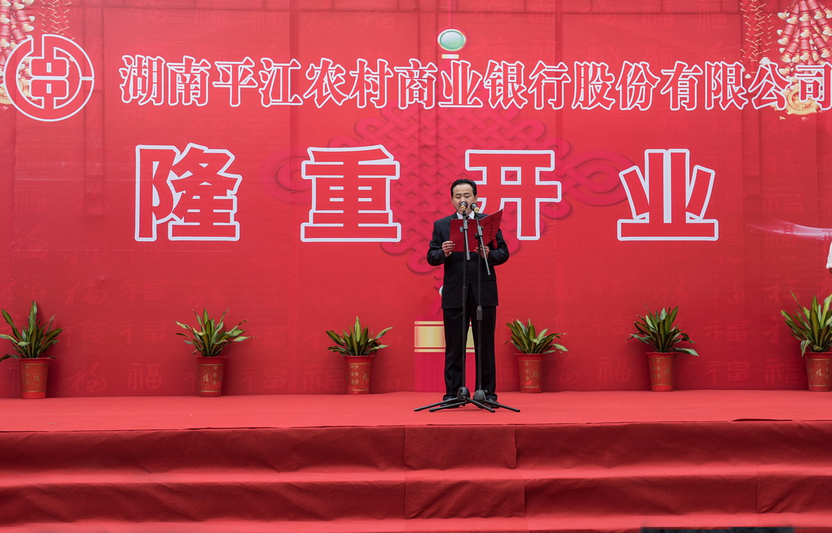庆典仪式上,岳阳银监分局贺爱卿副局长向平江农商银行颁发金融许可证;人民银行岳阳中心支行副行长袁曙光宣读了《平江农商银行加入人行管理与服务系统的批复》,平江农商银行董事长方玉书致辞,县委书记汪涛作重要讲话。省联社、省联社岳阳办事处、平江农商银行筹建工作小组等单位领导共120位嘉宾应邀出席了开业庆典。