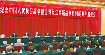 | 9月3日下午,中共中央、国务院、中央军委在北京人民大会堂举行座谈会,纪念中国人民抗日战争暨世界反法西斯战争胜利69周年。中共中央总书记、国家主席、中央军委主席习近平出席座谈会并发表重要讲话。 |