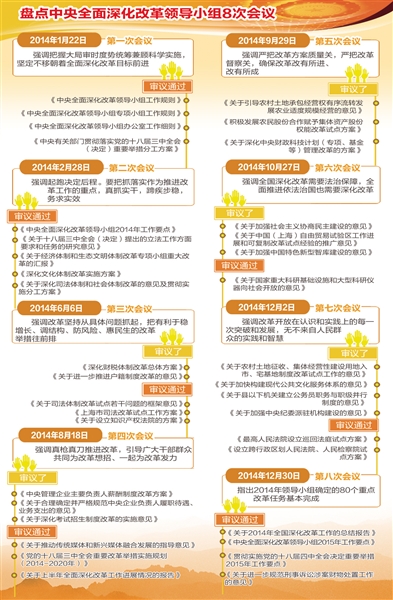 2014年是全面深化改革的开局之年,自2014年1月22日至12月30日,中央全面深化改革领导小组共召开了8次会议,对全面深化改革作出了一系列部署,审议通过的系列规则、方案、意见等重要文件,既着眼于破解当前面临的突出问题,又着眼于长远,为全面深化改革开好局、起好步、打牢基础。