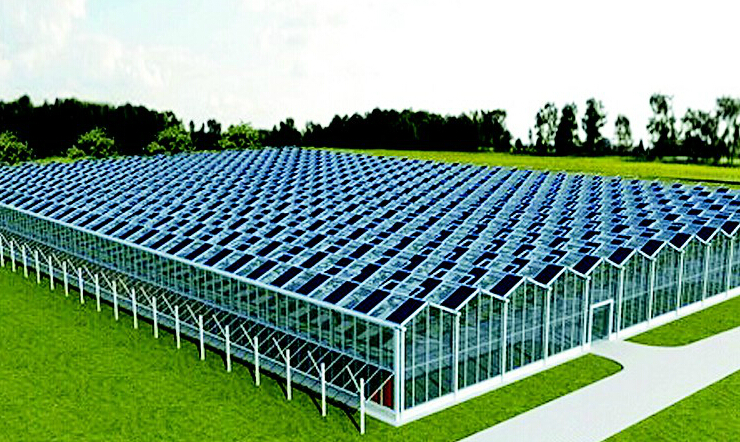 光伏温室的原理主要是光合作用,植物能够通过光合作用利用无机物生产有机物并且贮存能量。光伏大棚是使用太阳能电池组件作为大棚屋面的主要材料(多晶硅太阳能电池组件)。光伏发电系统为实现加热、降温、调光、遮光设备的能源,使其具有较灵活的调节控制温室内光照、空气和土壤的温湿度、二氧化碳浓度的温室,即使在寒冷的季节,只依靠太阳光来维持室内一定的温度水平,以满足蔬菜作物生长的需要。