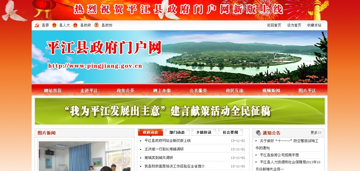 今天打开的平江政府网站是否让你感到了惊喜?展现在您眼前的是一个面貌全新的县政府网站。今年,平江县政府政务服务中心以创建“全国依托电子政务平台加强政务公开和政务服务工作百个试点县”为契机,以迎接湖南省政府网绩效评估为动力对网站进行了重大改版。新版网站于今天(11月1日)正式上线。