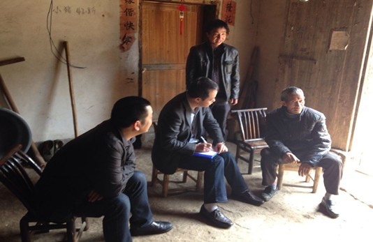 吴兴顺处长(左二)询问特困农户刘彭根(右一)