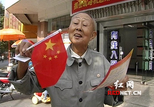 80岁的城关居民朱老爹领到小国旗后神采飞扬,感慨万千