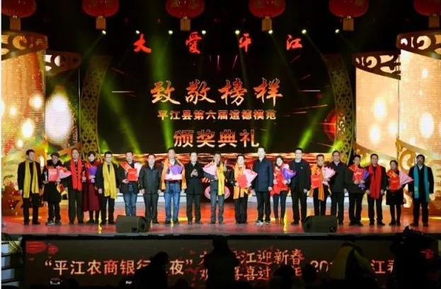 2月11日晚,在平江农商银行之夜——“大爱平江迎新春、欢欢喜喜过大年”2018平江县春节联欢晚会现场,我县表彰了平江县第六届道德模范和2017年“大爱平江”金牌爱心企业。县领导汪涛、黄伟雄、肖湘晖、黎耀辉、洪志凡、向风行、彭喜丰、胡伟、舒葵阳、欧阳晓耀、陈淼、周虎光、张满兰、熊江新、方辉为道德模范和爱心企业进行颁奖。
