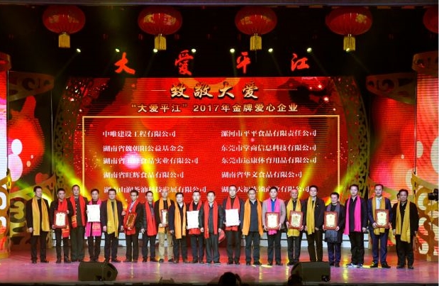 表彰的20家爱心企业,是2017年在大爱平江扶贫助困慈善行动中的部分爱心企业代表。2017年,我县启动“大爱平江”扶贫助困慈善行动,众多企业商家慷慨解囊、捐资捐物。通过社会各界的广泛参与,“大爱平江”扶贫助困慈善协会(基金会)共募集扶贫助困慈善基金1.2亿元。爱心企业和爱心人士用他们的关爱、善意和担当,用实际行动传递温暖,用大爱的精神感召着天南地北的平江人。(记者 周杏 图:赵智勇)