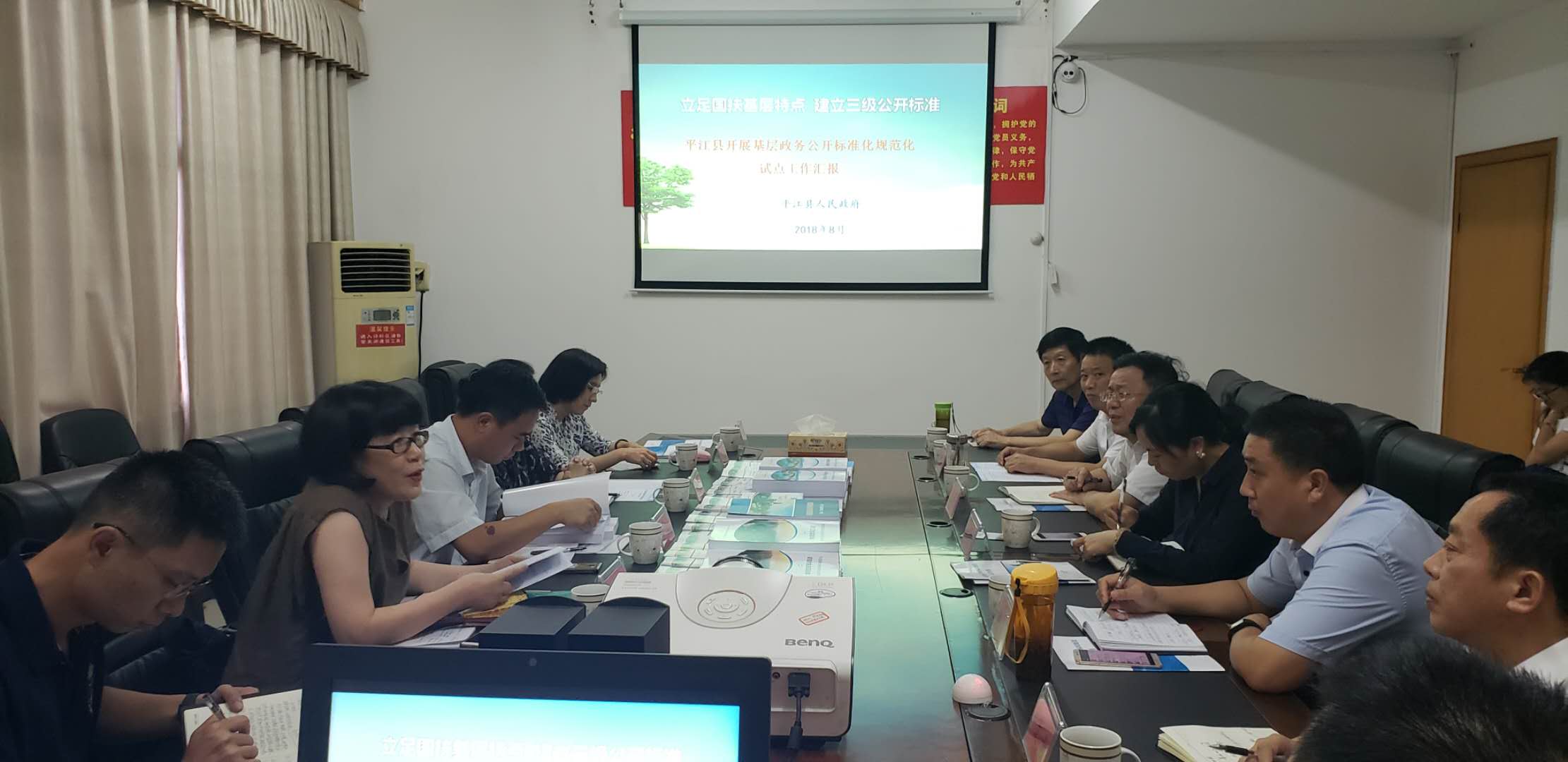 8月23日下午,由省政府办公厅政务公开办副主任柳江、省质监局标准化副处长刘红、省民政厅社会救助管理局副处长张颖、省质量技术评审中心副主任孙华等领导和专家组成的全省试点工作评估验收组抵达平江,对我县开展基层政务公开标准化规范化试点工作进行现场评估验收。市政务中心副主任童为华、县人民政府副县长梁金华、县政府办副主任李芸芳、县政务中心主任罗瑞等全程陪同验收。