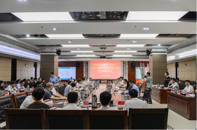 6月24日,在财政部、省财政厅的牵线搭桥、鼎力支持下,财政部金融司、社保司平江县脱贫攻坚帮扶活动签约捐赠仪式在我县举行。仪式现场,各帮扶单位与平江相关单位签约和捐赠了九大帮扶项目,这些项目涉及脱贫攻坚、乡村振兴、产业发展等,必将为我县由贫转强、跨越发展注入强劲动力。财政部金融司司长王毅、社保司司长符金陵,省财政厅副厅长李丙力等在现场见证签约。县委书记汪涛致辞。县委副书记、财政部驻平江县定点扶贫工作队队长邢朝虹出席。