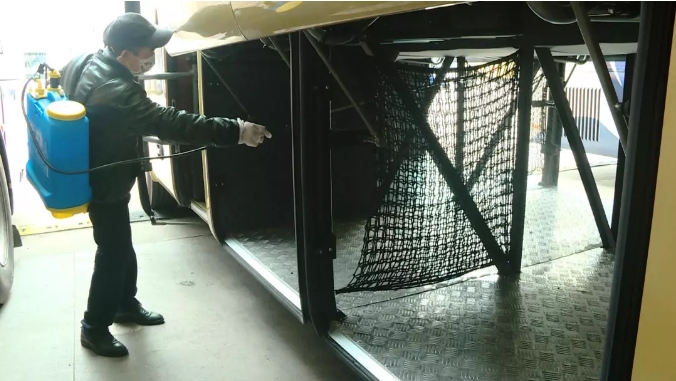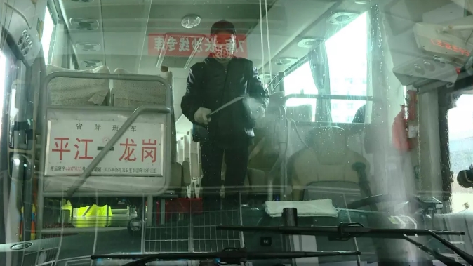 在天岳汽车站汽车安检站,工作人员正在对一辆平江至龙岗的客运班车进行消毒。天岳汽车站站长杨震告诉记者:“为确保乘客生命健康安全,我们已对站场公共区域、运营车辆进行了全面消毒,并对工作人员进行疫情防控知识培训。站内车辆必须消毒后才可以发车,驾驶员和乘务员必须佩戴口罩,并要求每天在发班之前进行体温测试。”