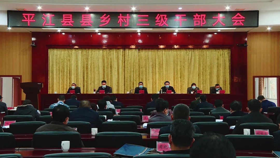 3月4日下午,平江县县乡村三级干部大会召开。会议认真贯彻中央、省委、市委决策部署,动员全县上下凝心聚力,顽强拼搏,共克时艰,奋力完成全年工作目标任务。县委书记汪涛出席并讲话,县委副书记、县长黄伟雄主持,县委副书记肖湘晖、邢朝虹,县人大常委会主任黎耀辉,县政协主席洪志凡出席。