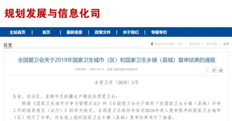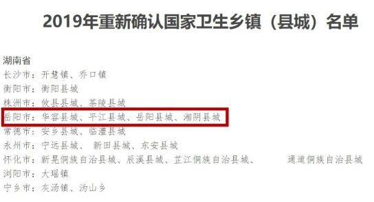 8月13日,国家卫健委在其官方网站发布《全国爱卫会关于2019年国家卫生城市(区)和国家卫生乡镇(县城)复审结果的通报》,在2019年重新确认国家卫生城市(区)名单和2019年重新确认国家卫生乡镇(县城)名单中,岳阳市和华容县城、平江县城、岳阳县城、湘阴县城均榜上有名。