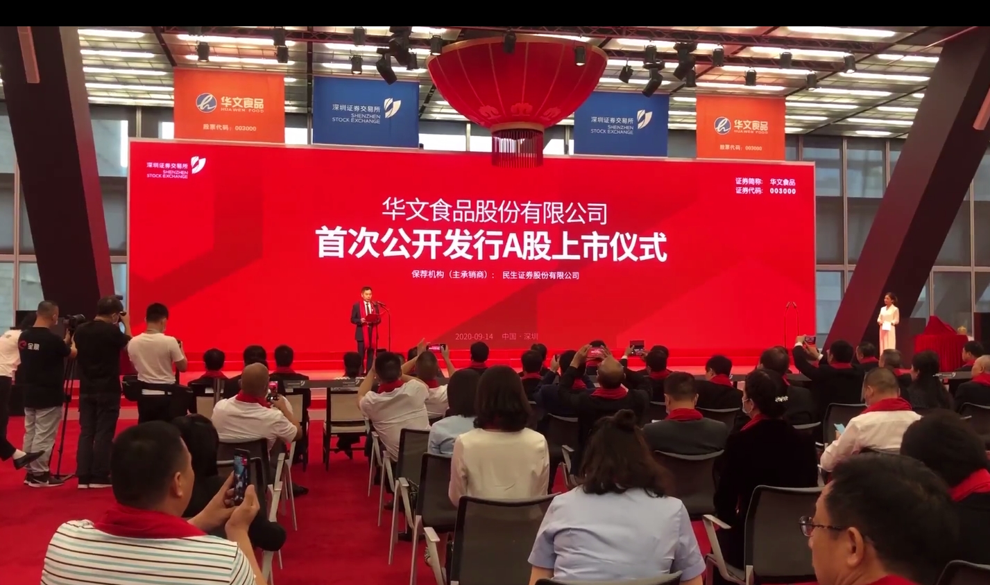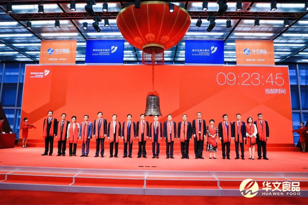 9月14日9时23分,位于平江工业园区的华文食品股份有限公司在深圳证券交易所敲钟上市,正式登陆A股中小板。市委书记王一鸥,省委原常委、省军区原政委李有新,市委常委、常务副市长李挚,市委常委、统战部部长胡建新,市委常委、市委秘书长谈正红,市人大常委会副主任陈光荣,市政协副主席、市发改委主任刘晓英,县委书记汪涛,县委副书记、县长黄伟雄,省地方金融监督管理局资本市场处处长易晓佳等领导出席上市仪式。