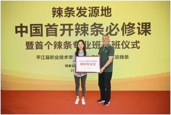 武汉轻工大学李庆龙教授,湖南农业大学食品科技学院原院长夏延斌教授,平江职业技术学校校长向伟卫,副校长李清龙、李殿龙,麻辣王子董事长张玉东、总经理黄晓丹,以及来自全国的10余家权威媒体代表、首届辣条班全体同学、家长代表等参与开班仪式。在热烈的掌声中,向伟卫宣布全国首个辣条班开班,张玉东为首个辣条班授牌。
