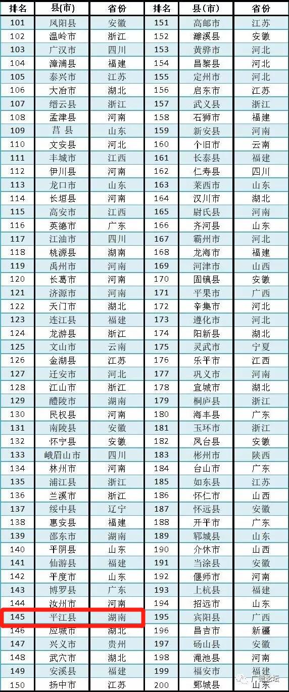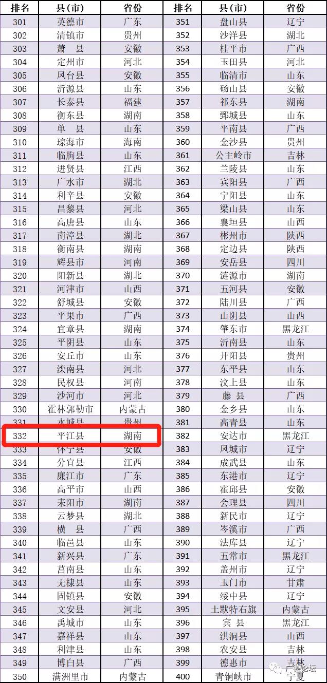 平江县位列全国县域经济综合竞争力第332位,全国县域投资潜力第145位。这份数据来自于中国社会科学院财经战略研究院和《华夏时报》共同发布的《中国县域经济发展报告(2020)》暨全国百强县(区)报告。
