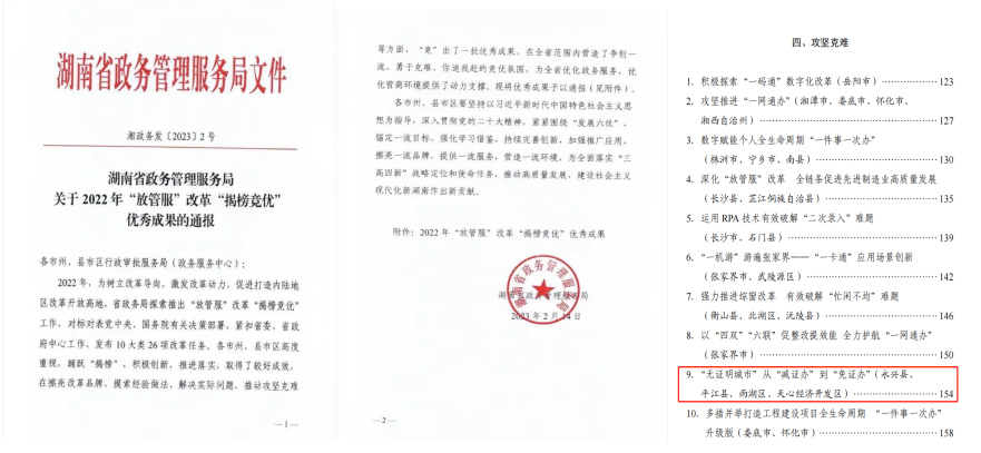 近日,湖南省政务管理服务局通报了2022年“放管服”改革“揭榜竞优”优秀成果,我县“无证明城市”建设成功入选攻坚克难类表彰。