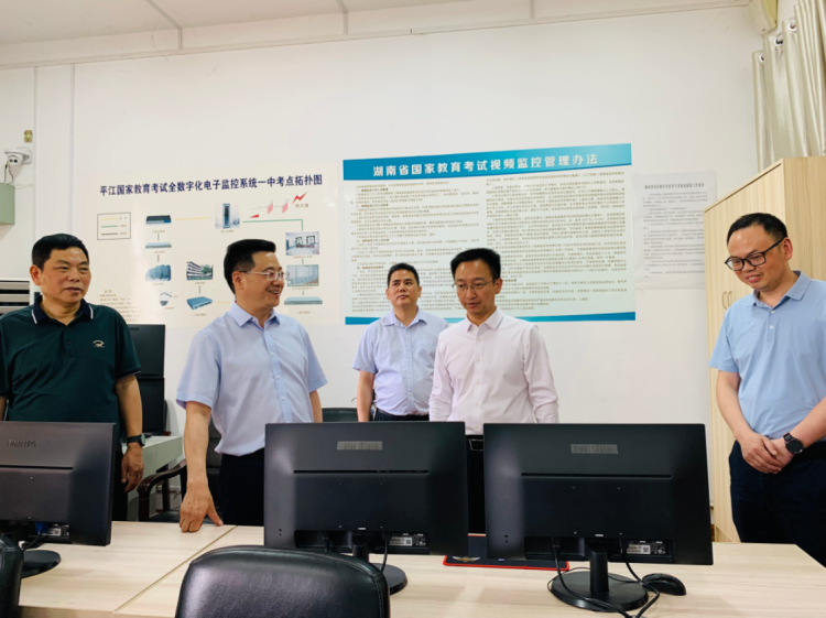曹文才一行先后来到县教育局、平江一中、平江二中等地,实地察看了校园安防设施、视频监控指挥中心、语音广播室等重点场所,详细了解考场设置、考务培训、后勤保障、应急处突等相关工作的落实情况。