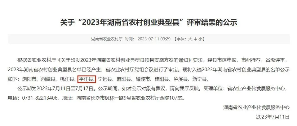 近日,记者从湖南省农业农村厅获悉,2023年湖南省农村创业典型县名单正式“出炉”,平江县获评2023年湖南省农村创业典型县,将获得50万元的奖补资金,祝贺!