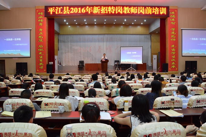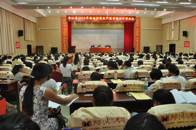 8月26日下午,“平江县2016新招特岗教师岗前培训开学典礼”举行,从平江县本地精选的名师专家,为450名来自全国各地的新教师进行5天的岗前培训。