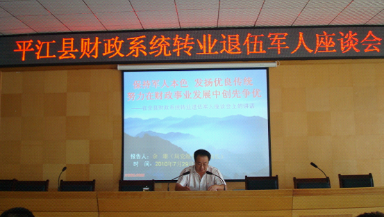 会议由局党组副书记、副局长陈沛泉主持。全体与会人员还观看了老红军、老党员、原中央监察委员会驻财政部监察组长喻杰同志的感人事迹专题片,听取了高级讲师、中共平江县委党校原校长许何生关于世界观、人生观、价值观的精彩演讲。童江伟等6位退伍军人代表在会上发言,畅谈了他们当兵、学习、理财、做人、做事的体会。江江等17位优秀转业退伍军人受到了表彰。